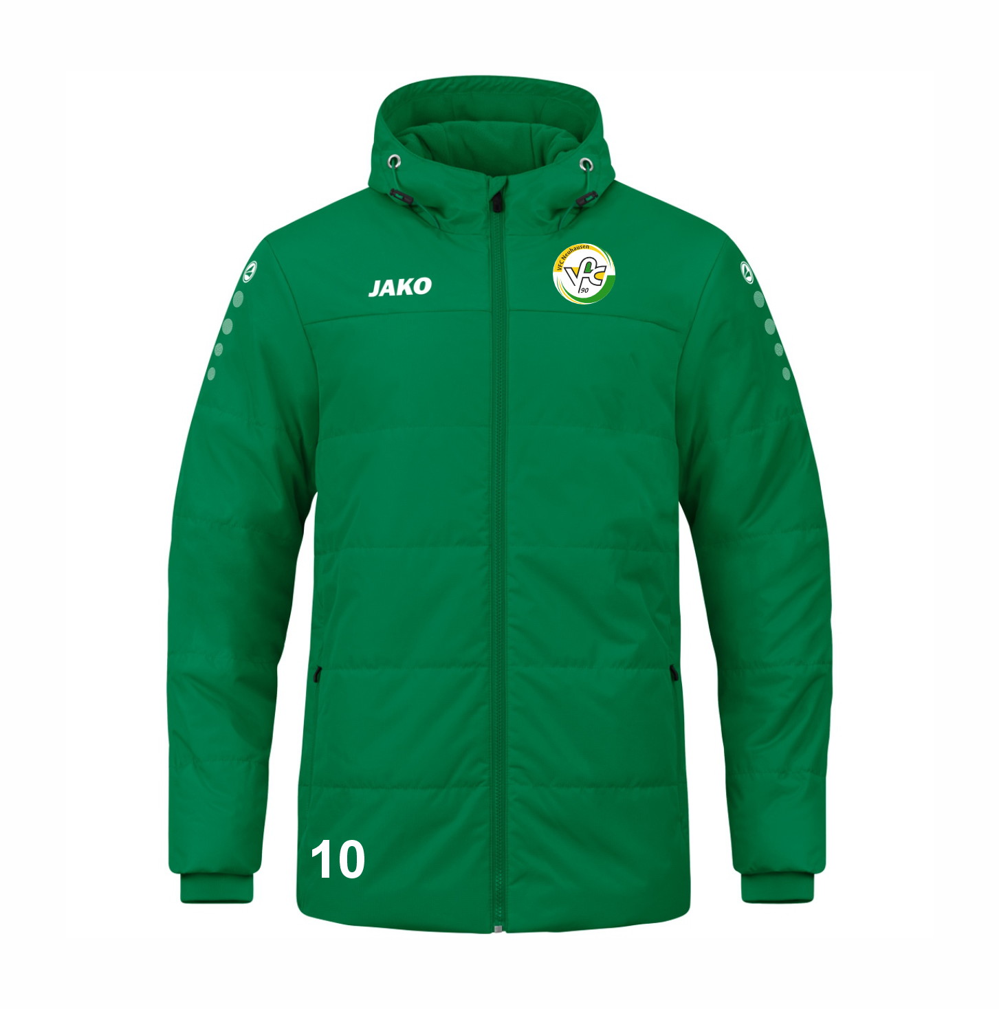 Wasserabweisendes Obermaterial, wärmeisolierende Wattierung und weiches Fleece an der Innenseite machen die JAKO Coachjacke Team zur optimalen Ausstattung bei kühleren Temperaturen. Bei widrigem Wetter kannst Du die im Kragen intergierte Kapuze tragen. Des Weiteren schützen integrierte Ripp-Bündchen in den Ärmeln, dem Kordelzug und den Stoppern sowie an der Kapuze vor dem Eindringen von Wind und Regen. So garantiert die Jacke optimalen Tragekonform.